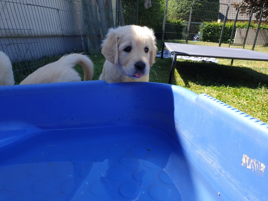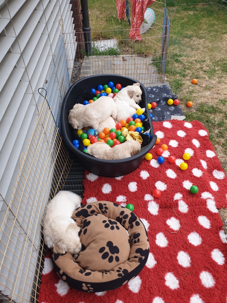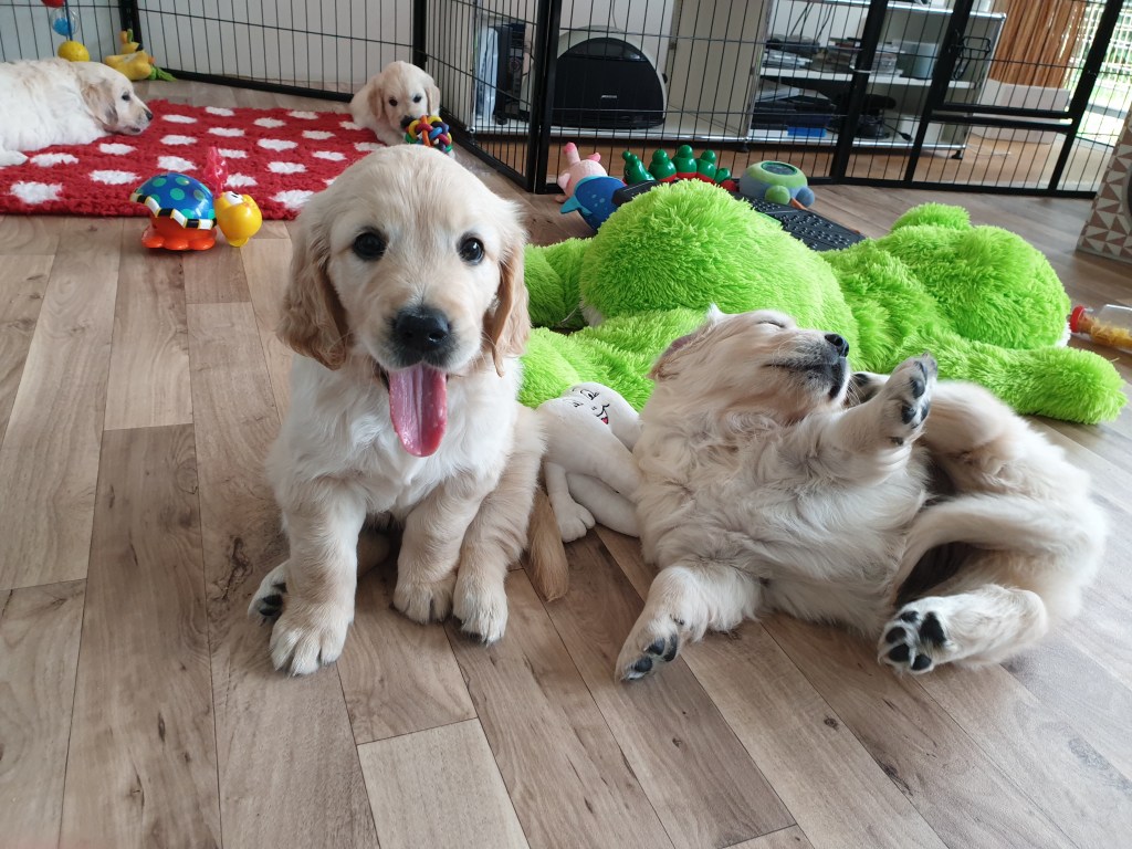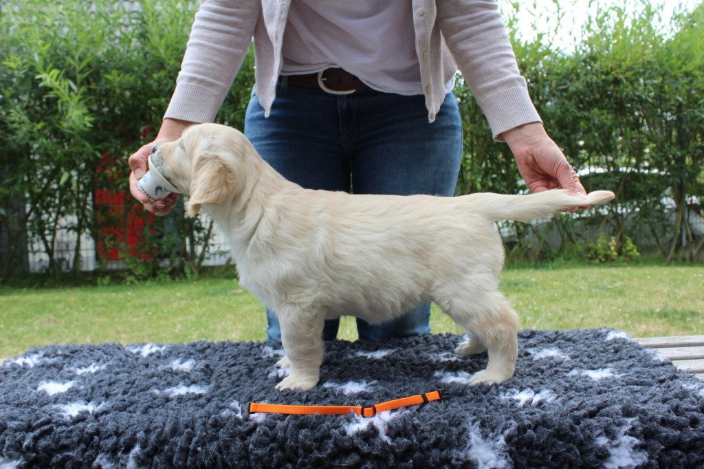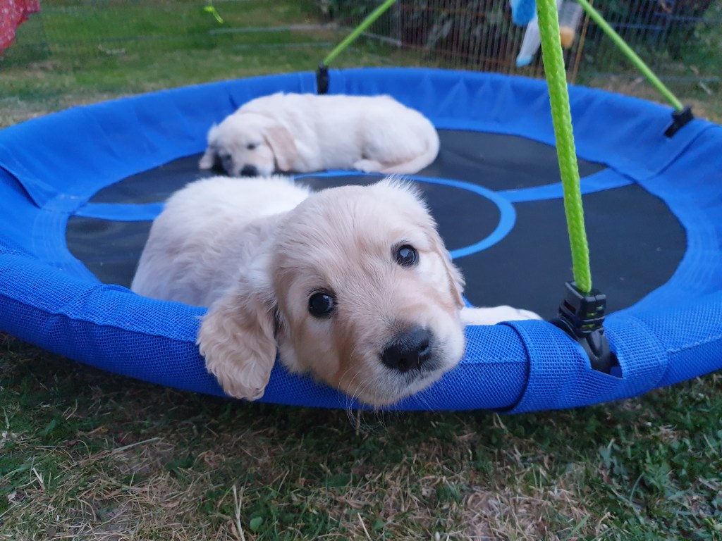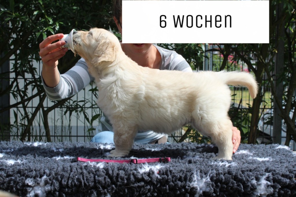 10.06.20: Etwas verspätet die Bilder der sechsten Woche. So langsam heißt es Endspurt. Nur noch 2 Wochen, bis die kleinen in ihre neuen Familien ziehen. Die neuen Welpenfamilien kommen regelmäßig zu Besuch, worüber die fünf sich sichtlich freuen. Endlich haben auch alle einen Namen und so stellt sich unser A-Wurf nun auch ganz offiziell vor: