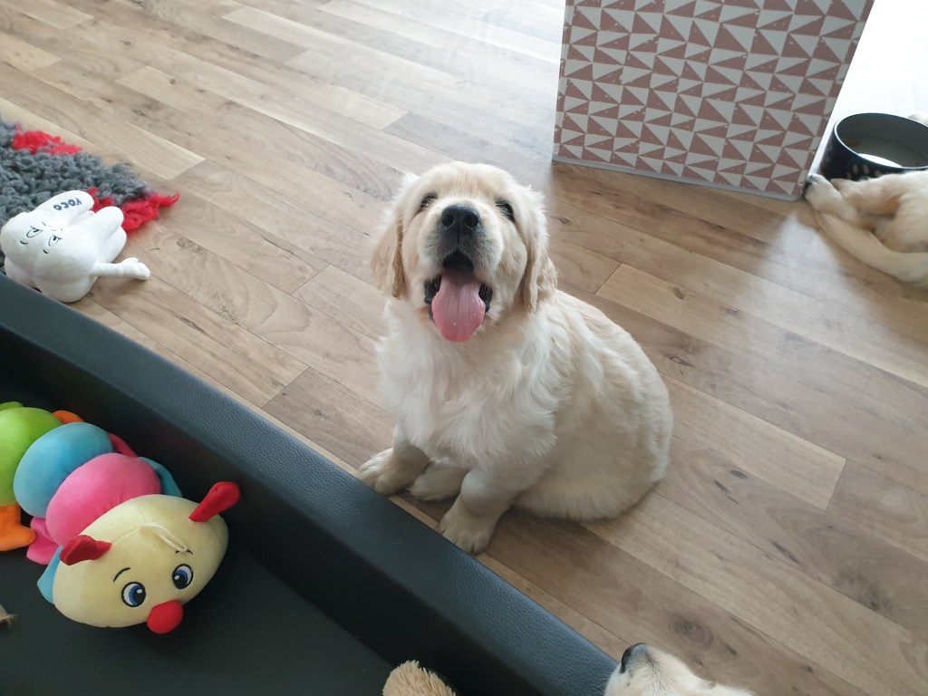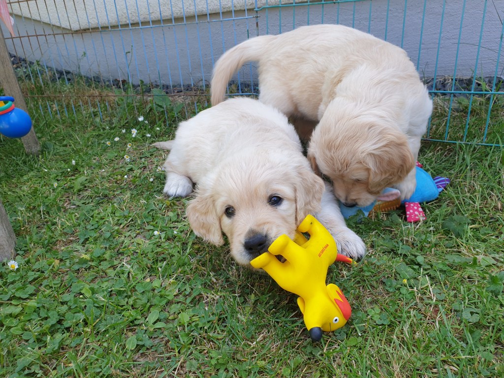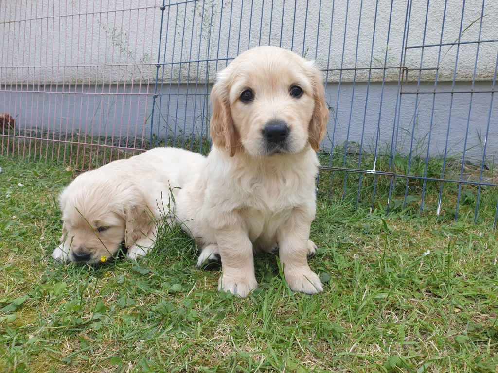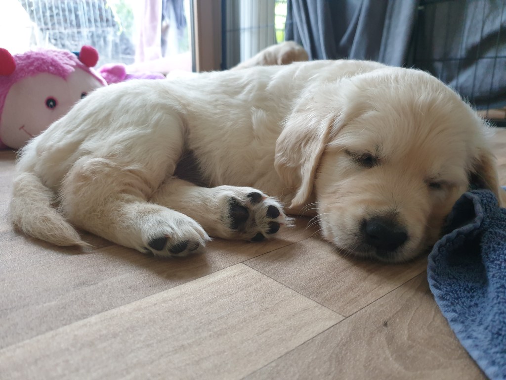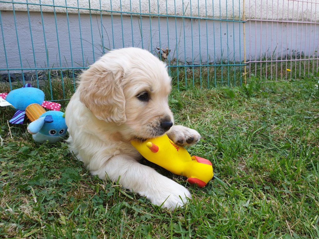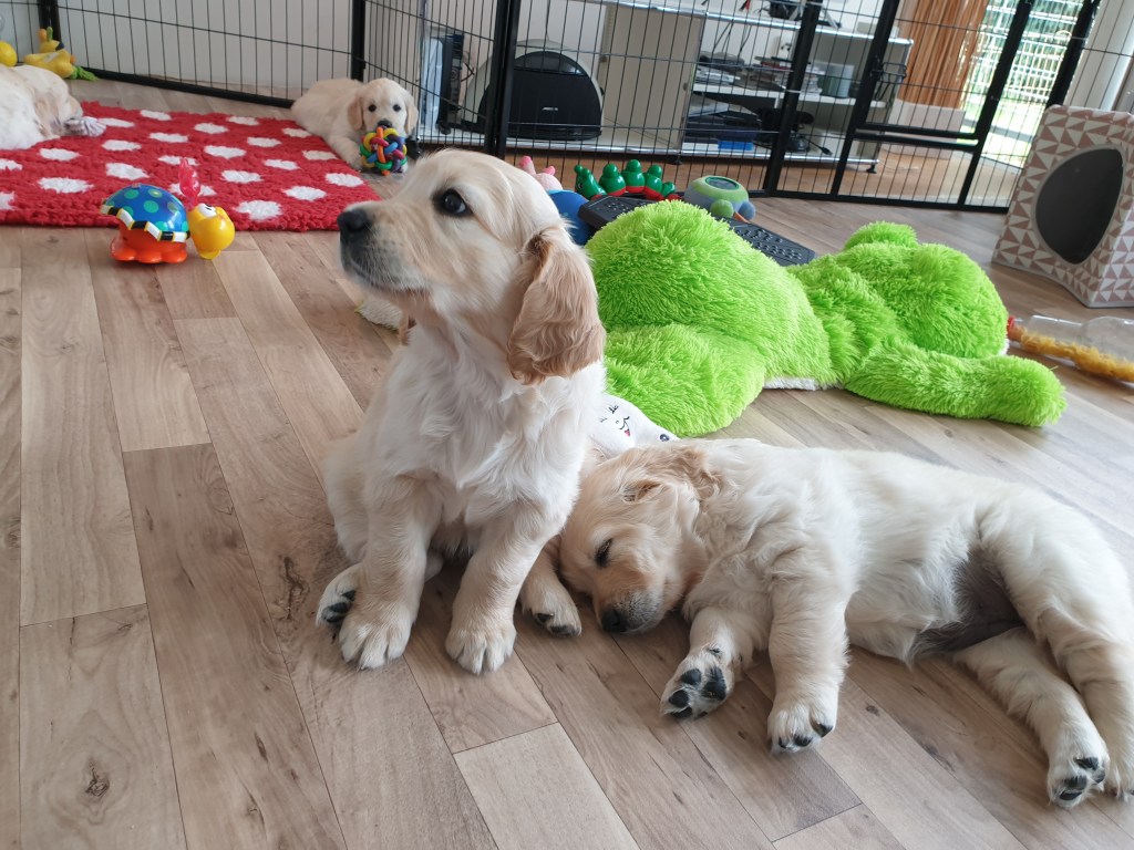 10.06.20: Etwas verspätet die Bilder der sechsten Woche. So langsam heißt es Endspurt. Nur noch 2 Wochen, bis die kleinen in ihre neuen Familien ziehen. Die neuen Welpenfamilien kommen regelmäßig zu Besuch, worüber die fünf sich sichtlich freuen. Endlich haben auch alle einen Namen und so stellt sich unser A-Wurf nun auch ganz offiziell vor: